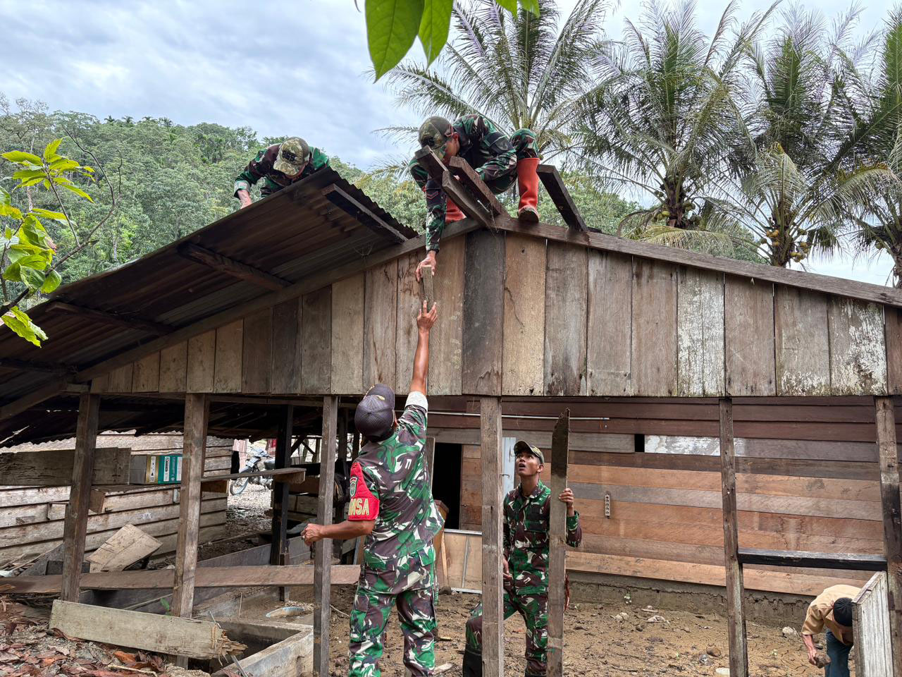 Upaya personel TNI bergegas membantu pembongkaran rumah milik Kamsiah dan sejumlah rumah warga yang tidak layak huni akibat tertimbun material tanah longsor, sambil menunggu program bantuan Hunian tetap (Huntap) dari pemerintah.(ogit)